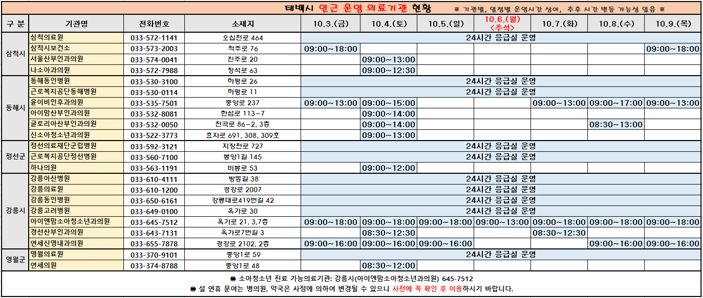 2025년 추석 연휴 태백시 의료기관·약국 운영 현황을 안내드립니다.