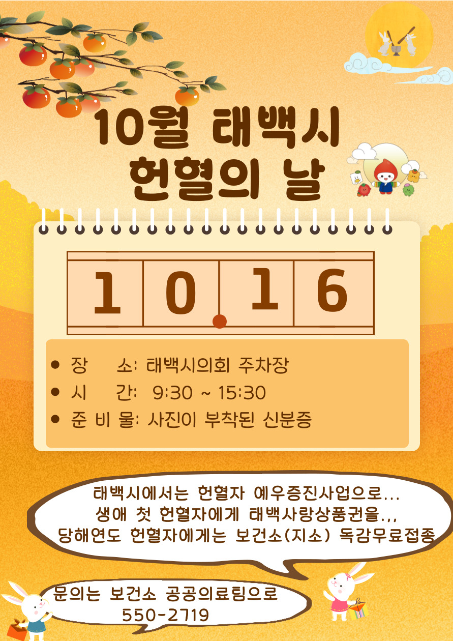 헌혈을 통한 헌혈 문화 확산에 동참 해주시기 부탁드립니다. ○ 2025년 10월 '헌혈의 날' 운영 안내 - 일 정 및 장소 * 2025. 10. 16.(목) - 태백시의회 주차장 - 시 간: 9:30 ~ 15:30(12:00~13:00점심시간) - 준비물: 사진이 부착된 신분증 ○ 태백시 헌혈자 예우증진사업 - 태백시에서 생애 첫 헌혈자에 대한 태백사랑상품권 1만원 * 예산소진시 까지 - 당해연도 헌혈자 보건소 독감무료접종 * 백신소진시 까지 |