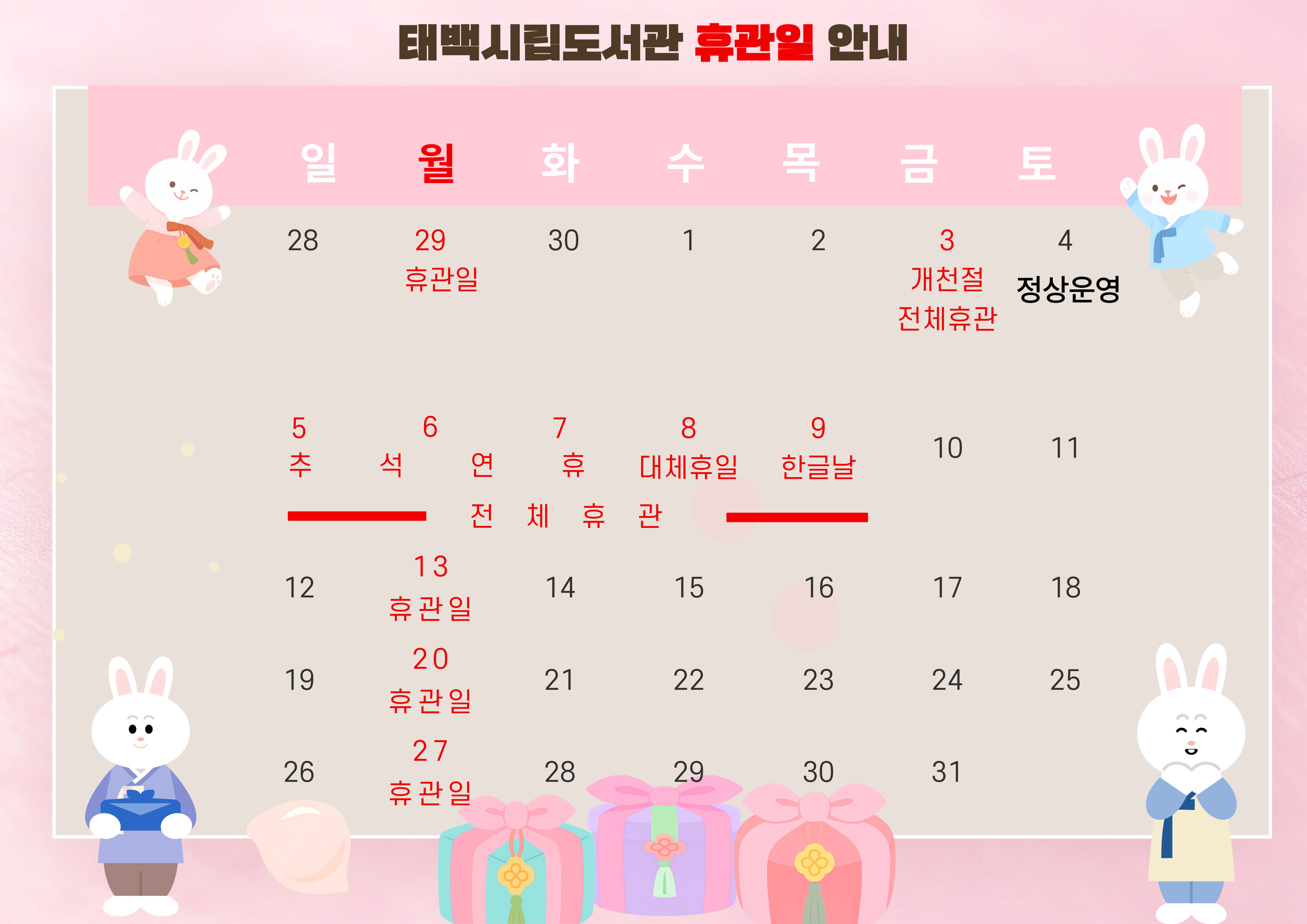 10월 3일 (금) : 개천절(전체휴관) 10월 4일 (토) : 정상 운영 10월 5일 (일) ~ 7일 (화) : 추석연휴(전체휴관) 10월 8일 (수) : 대체휴무 휴관 10월 9일 (목) : 한글날(전체휴관) 10월 13일, 20일, 27일 (월) : 정기 휴관 입니다. |