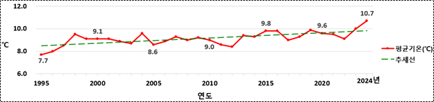 | 연평균기온(℃) | 9.8 | 9.8 | 9.0 | 9.3 | 9.9 | 9.6 | 9.5 | 9.1 | 10.0 | 10.7 |