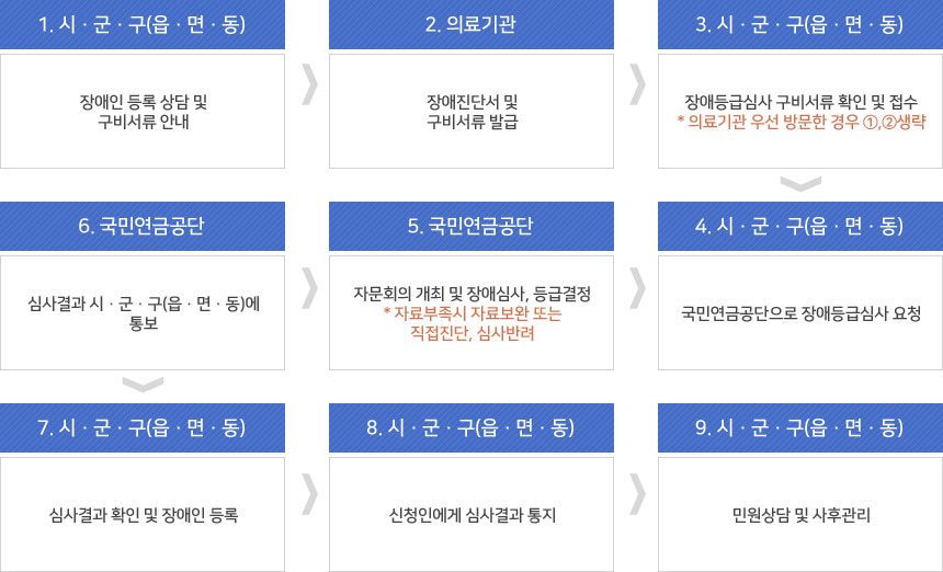 장애인등록 SNS 공유하기 페이스북에 담아가기 트위터에 담아가기 현재 페이지 출력하기 ※ 근거규정 : 장애인복지법 제29조(장애인등록) 및 동법시행규칙 제3조 내지 제11조 등록대상 지체, 뇌병변, 시각, 청각, 언어, 지적, 정신, 자폐성, 신장, 심장, 호흡기, 간, 안면, 장루요루,간질 등 15종류 등록절차 원본 이미지 보기
