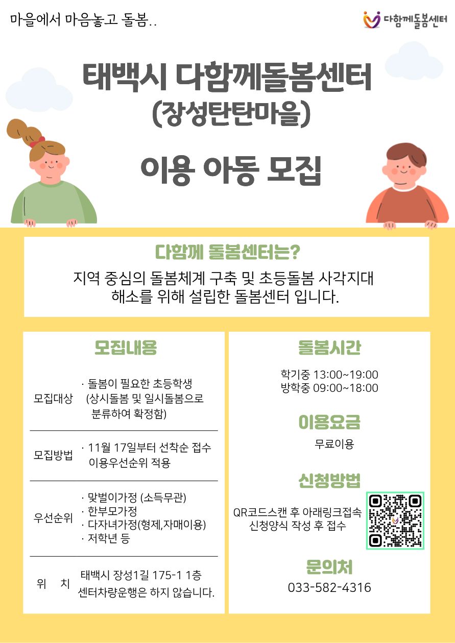 | 제목 | 태백시 다함께돌봄센터(장성탄탄마을) 이용 아동 모집 공고 |