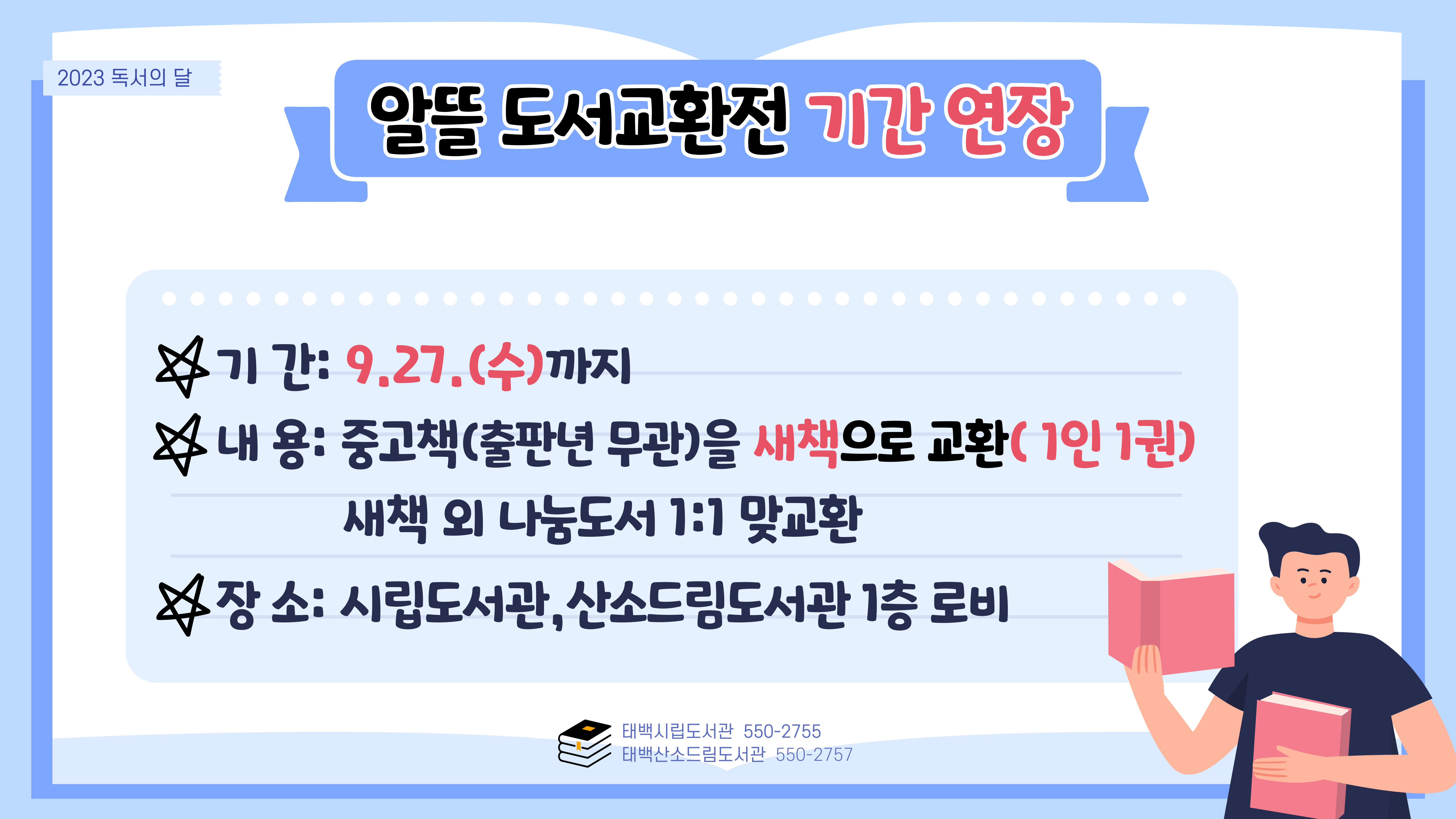 | 제목 | 시립도서관·산소드림도서관 알뜰도서교환전(기간 연장) |