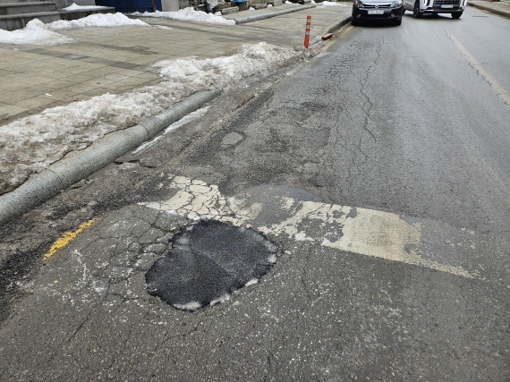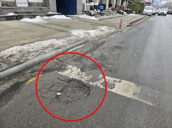 ○ 조치일시 : 2024. 2. 1. (목) ○ 조치내용 : 도로노면 노후 및 차량으로 인한 노면파손 (보수재사용 도로 노면 임시정비) |