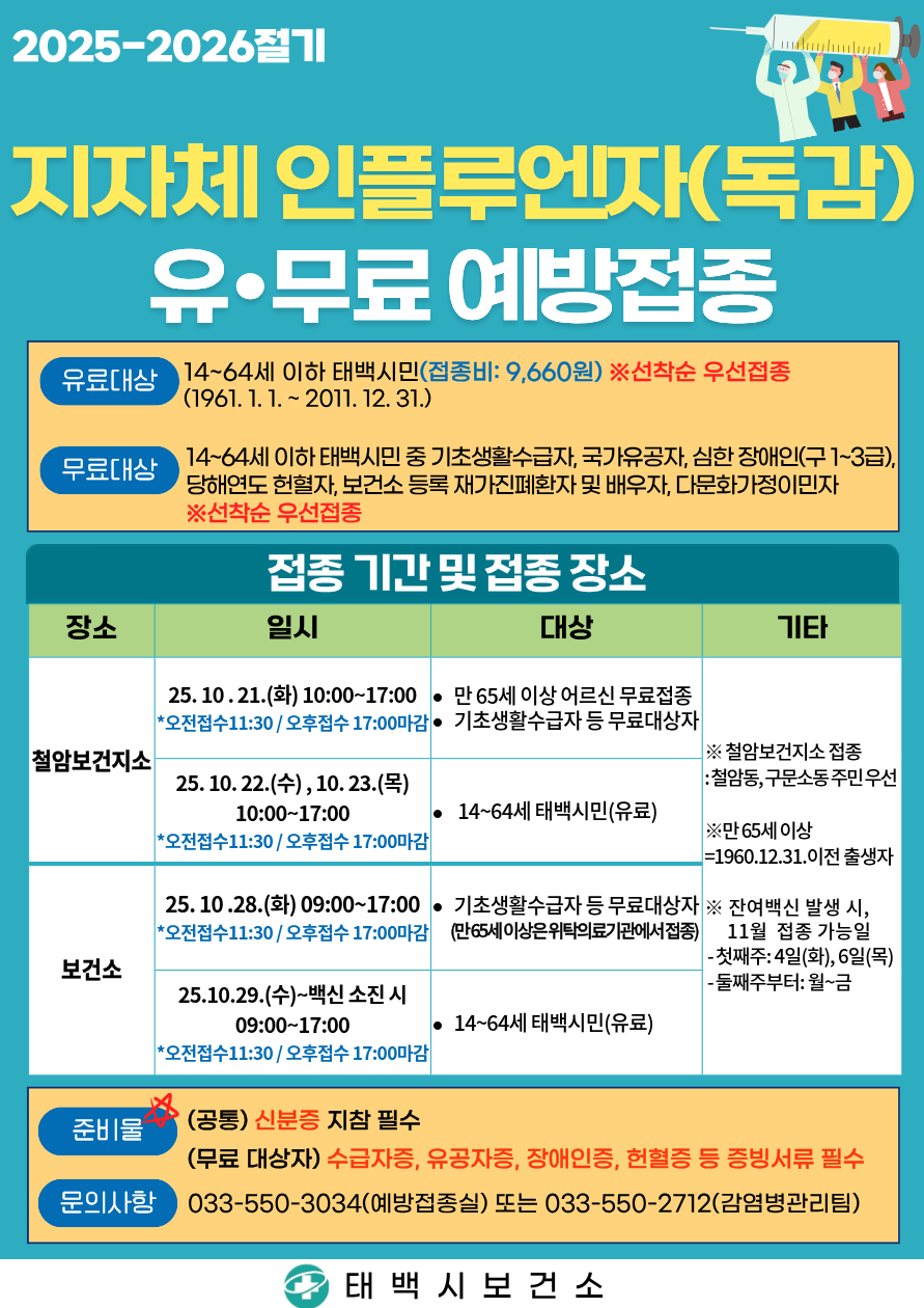 유료대상: 14~64세 이하 태백시민(접종비 9,660원) 무료대상: 14~64세 이하 태백시민 중 기초생활수급자, 국가유공자, 심한장애인(구1~3급), 당해연도 헌혈자, 보건소 등록 재가진폐환자 및 배우자, 다문화가정이민자 ※유, 무료 모두 선착순 접종 ※준비물 (공통) 신분증 지참 필수 (무료대상자) 수급자증, 유공자증, 장애인 복지카드, 헌혈증, 다문화가정이민자는 가족관계증명서 등 증빙서류 필수 ※ 예진표를 사전에 작성 후 내원하시면, 현장 대기시간 단축할 수 있습니다.(붙임파일 참조) ※ 학생 혼자 방문할 경우, 예진표 및 부모님 동의서 작성 후 내원할 수 있도록 해주세요. |
